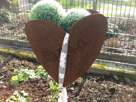 aus Blech, ca. 50 cm breit, mit Metallstab mit individuellem Schriftzug, wahlweise mit oder ohne Patina