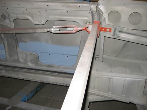 Bei mir hat sich folgendes bewährt. Wenn sie die Karosserie von der Bodengruppe trennen müssen und wollen, muss die Karosserie auch ausgesteift werden und das machen sehr viele falsch, denn sie befestigen immer die Versteifung an den Aufnahmen Türscharnier A-Säule zur Türfalle B-Säule.